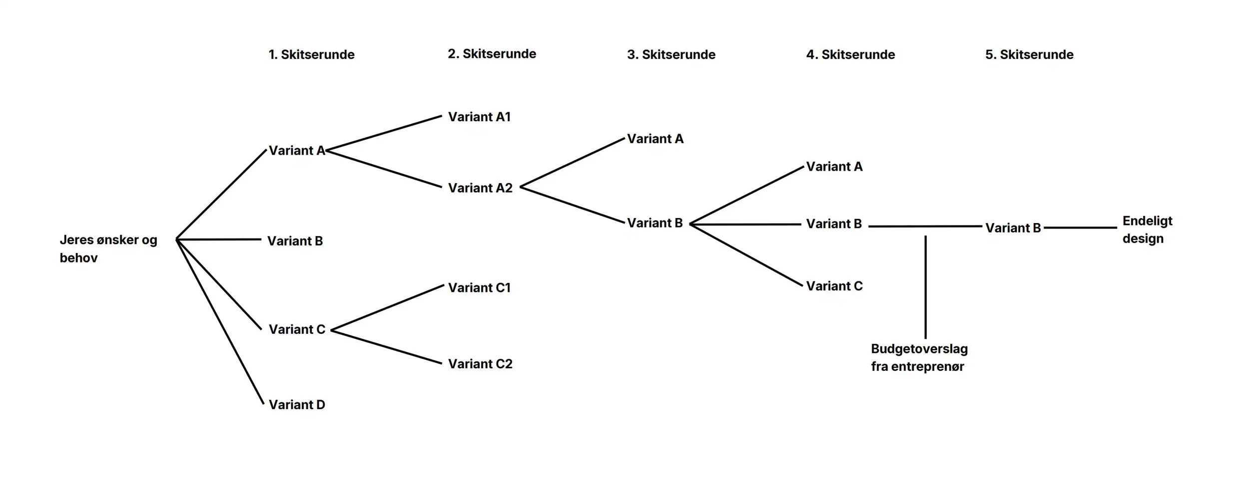 Hos Bjørn arkitekter arbejder vi med en åben og inkluderende proces, dermed er i garanteret at i bliver tilfredse med det endelige resultat. Helt konkret betyder det at vi tegner flere varianter, holder møde vælger ud og arbejdere videre indtil i er tilfredse. Nå designet er lige ved at være på plads får vi udarbejdet et detaljeret budget, dermed sikres i at det tegnede forskal kan bygges indenfor budgettet.